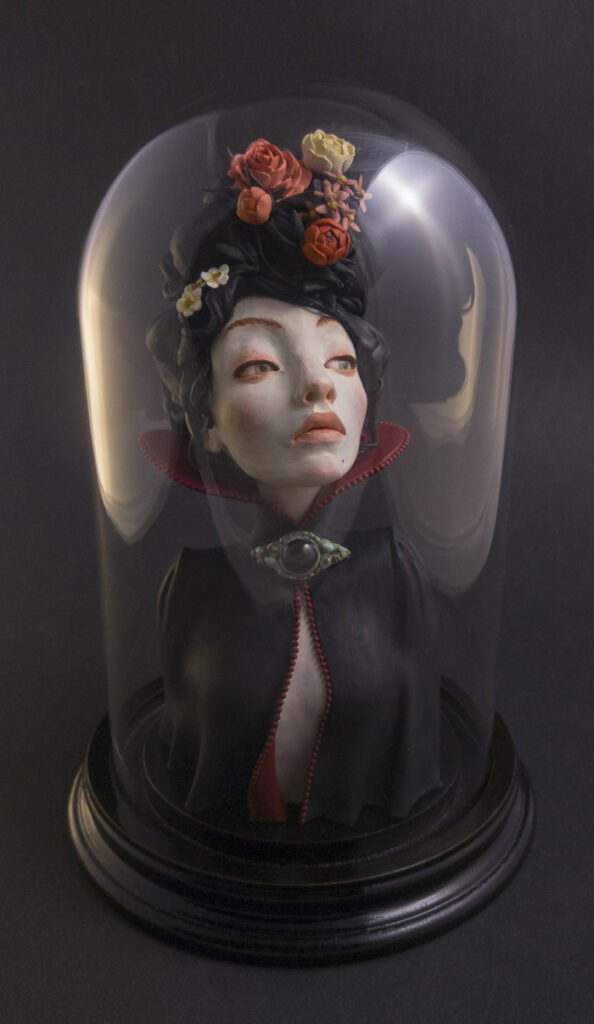 This sculpture, which had been in stand-by for more than a year, is finally finished! The large collar and the dress are entirely made of polymer clay, and hand painted. Sounds like real lace, doesn’t it?Voilà “Lady W.” ! Elle m’a été inspiré par un personnage de littérature, devinerez-vous qui ?